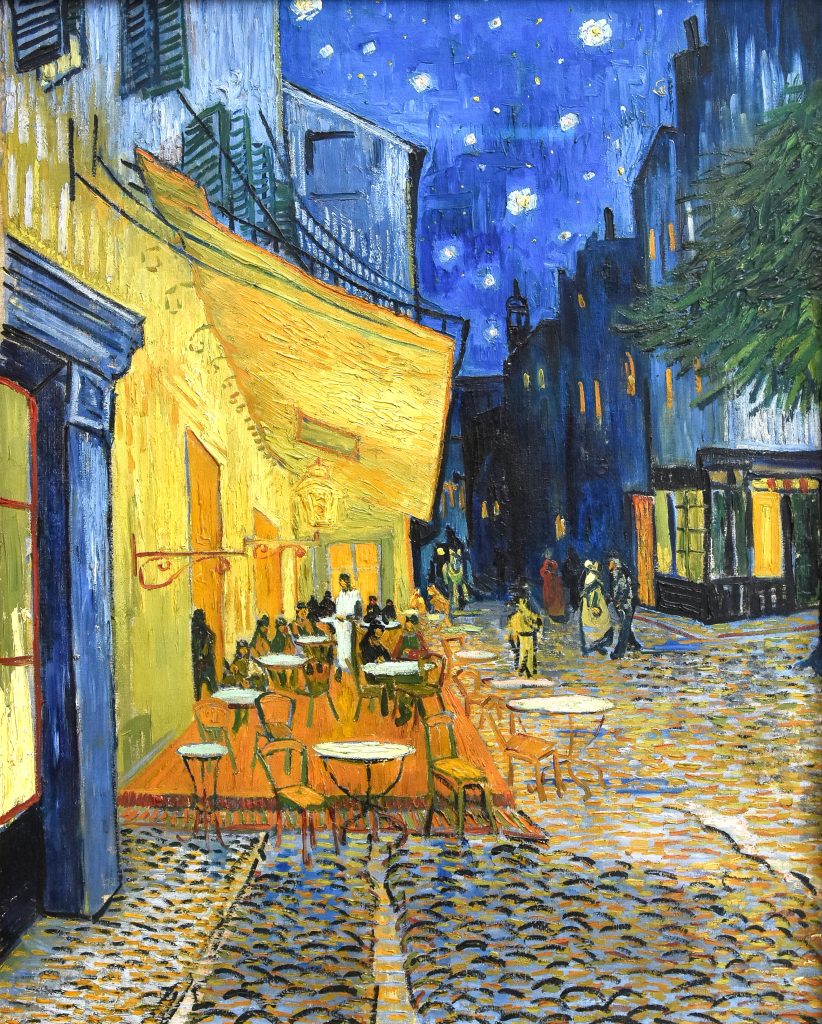 A piece of the night sky with stars is also visible in the famous painting Café Terrace at Night of the Terrace Café Place du Forum, Arles, 1888. This café has since been renamed Café van Gogh and is now a tourist attraction at Place du Forum in Arles. Some will say tourist trap, unfortunately. The painting belongs to the Kröller-Müller Museum in Otterlo, the Netherlands.